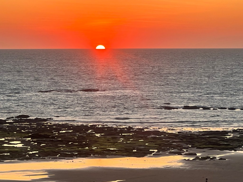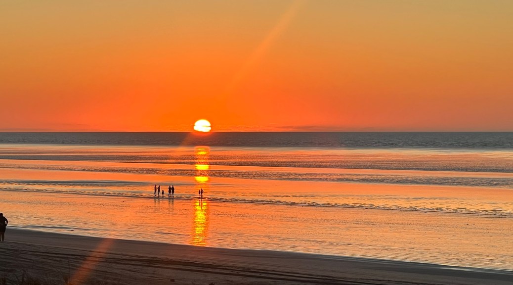 We head back to the beach for sunset and it’s a beauty over the water. The tide has gone so far out, about a kilometre at least we thought and amazingly I seem to catch a stairway to the sun photo over the flats!