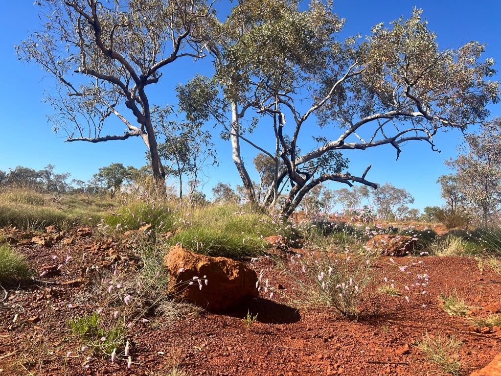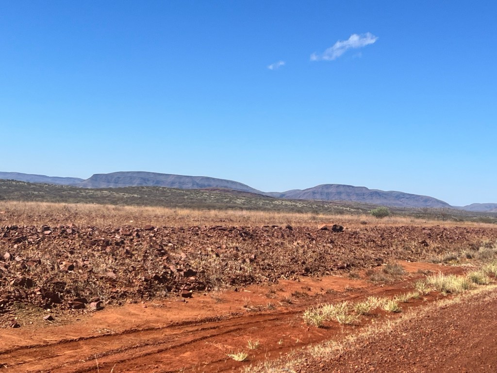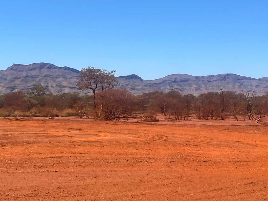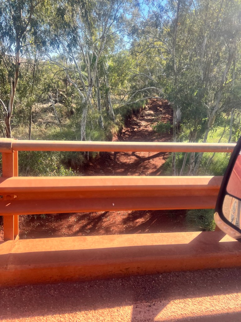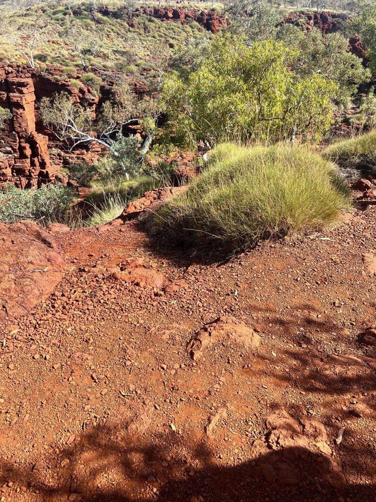 It’s about 62km down a very red road. It’s gravel but a good road, wide and not too corrugated. Obviously used for mining traffic and we have Hamersley Range on our right for most of the drive there. The colours are vibrant and the deep russet red of the road has drifted into all the vegetation alongside the road, trees and shrubs alike.
