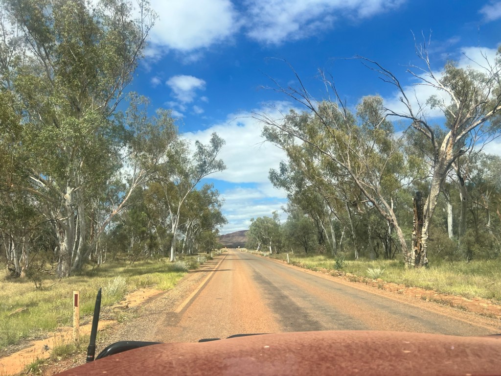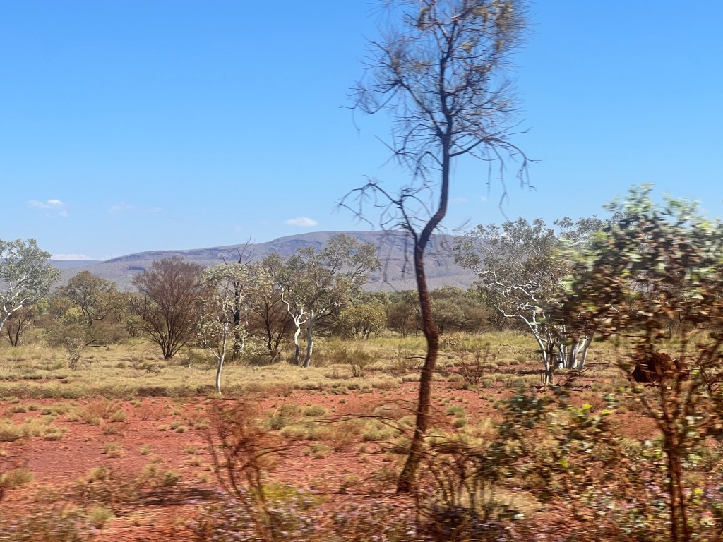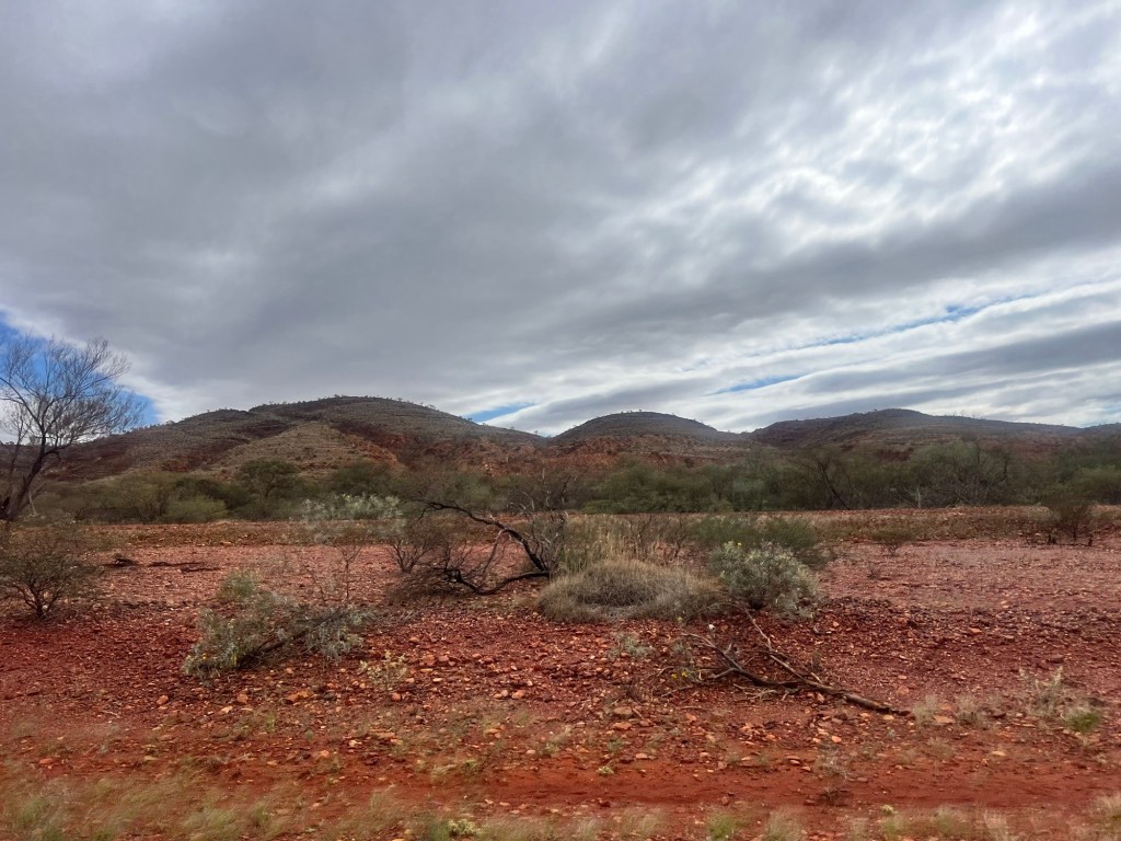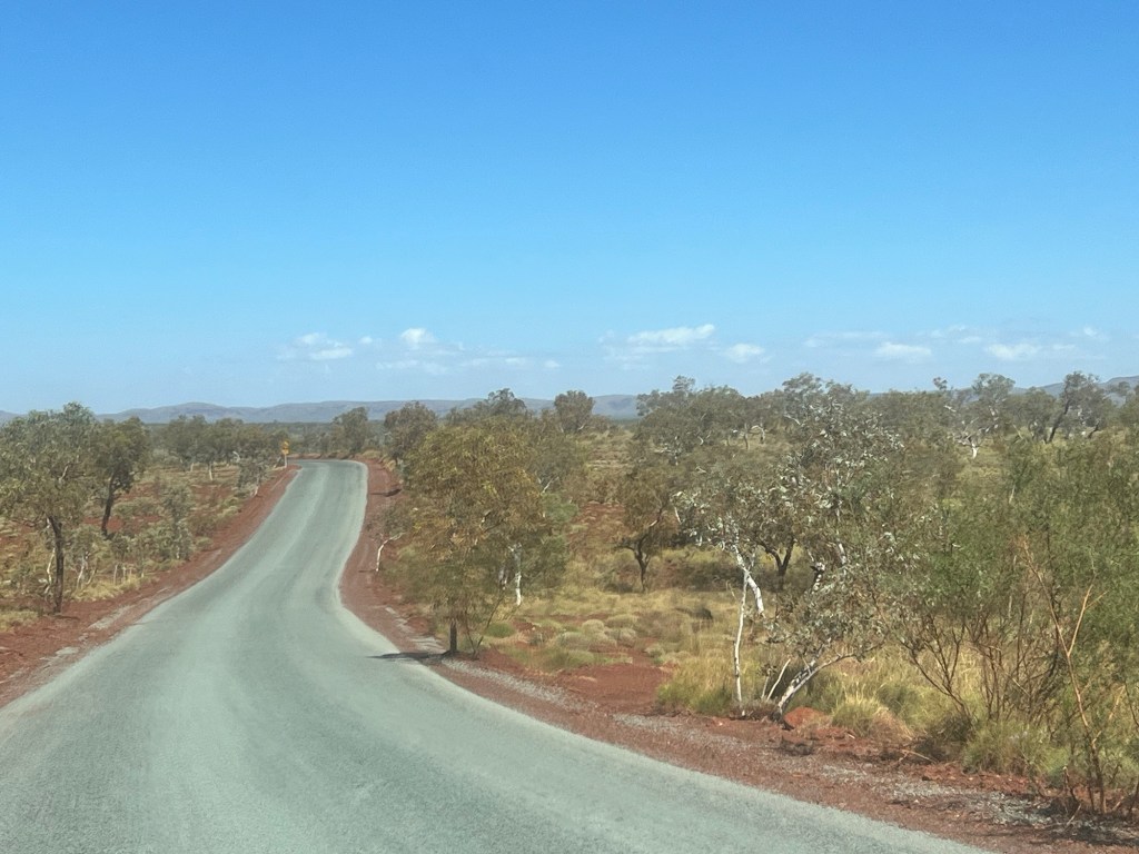 We set of just after 9am and arrive at Paraburdoo around 12pm. Along the way we pass amazing scenery that changes from really green to really dry. We see amazing creek beds, ranges and long stretches of highway. The scenery constantly changes, as do the colours showing deep hues of russet and grey blue under the overcast sky and then bright greens and ochres under the sun.