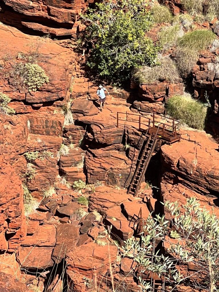 From the lookout it’s a good 280 steps and stairs down to the Falls so I’m happy to sit and enjoy the view while I wait for Rob. A ranger stops and we have a brief chat and she tells me there are 2-3 rescues for sprains and breaks in the Gorge each week! Each one takes about 5-8 hours to rescue and the nearest medical is Tom Price about 80km’s away from here. The ranger also tells me she does the stairs about 5 times a day, every shift, wow. The ranger tells me Oxer lookout at Hancock Gorge is the best in her opinion. That’s next on our trip today.