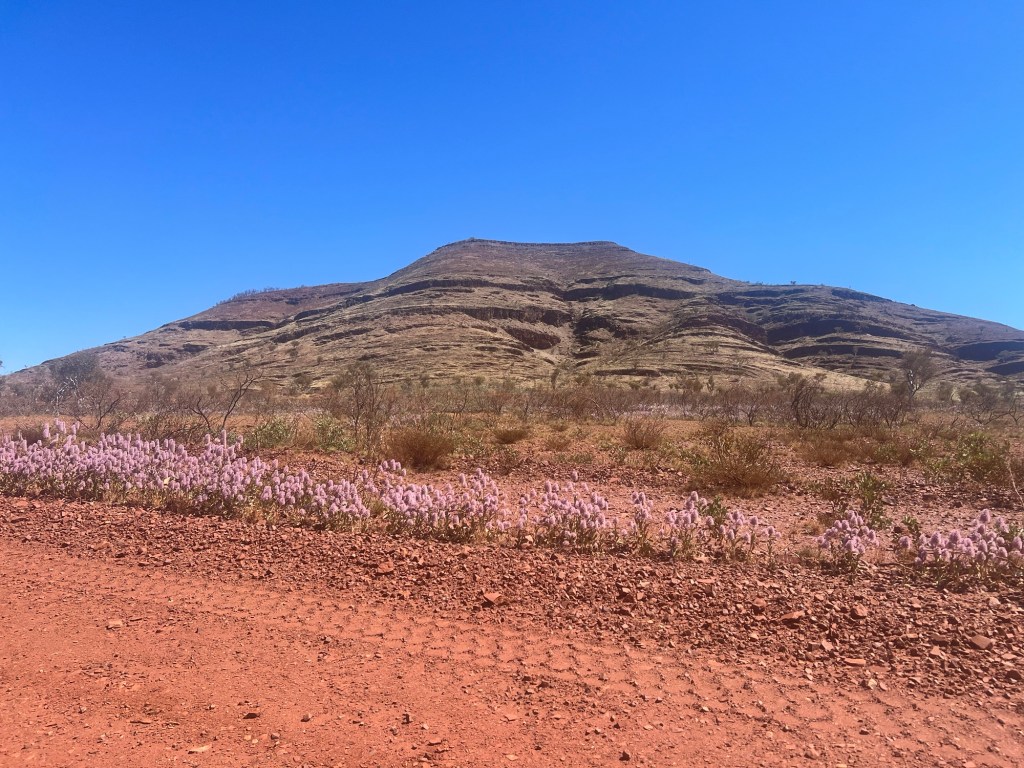 Leaving Paraburdoo we start to see lots of wildflowers and then we are stopped at roadworks and hear that a 10m wide load is coming from one of the mines so we find a spot to pull off and wait for it. There’s two and they’re big!