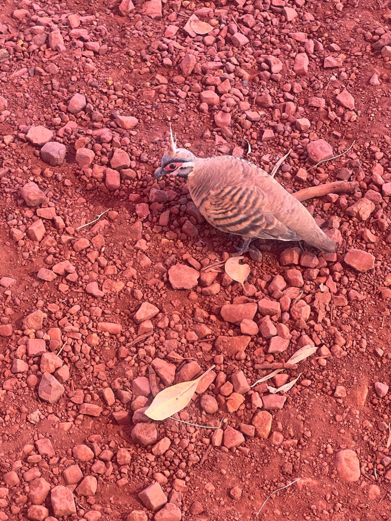 Rob decides to do the Kermit’s pool walk so we return to the park and I sit in the shade admiring a cute Spinifex Pidgeon pair. He’s dancing but she’s having none of it! It hit 32 at 2:30pm so it’s quite hot.